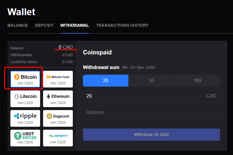 Cliquez sur “Retrait” et précisez le montant que vous souhaitez retirer. Choisissez CoinsPaid comme méthode de retrait. Collez l'adresse de votre portefeuille crypto dans le champ correspondant.