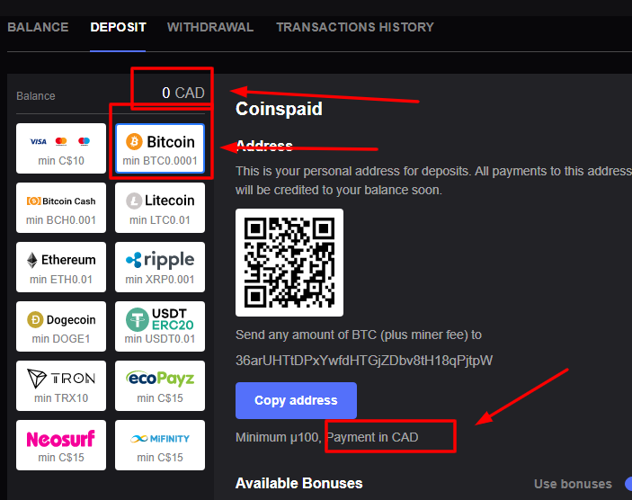 Suivez ces étapes simples pour effectuer un dépôt dans notre casino via le portefeuille crypto CoinsPaid :