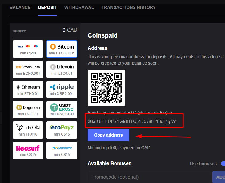 Copiez l'adresse du portefeuille et insérez-la dans le champ correspondant de la section “Envoyer” de votre compte CoinsPaid. Si vous disposez des codes promotionnels, utilisez-les pour bénéficier d'incroyables bonus chez Mirax.